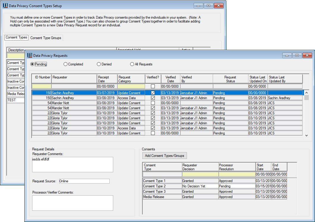 Created a new Data Privacy activity center in J1 Desktop to track the various requests that have been made in a historical fashion and give a way to act on the requests. Two new windows, Data Privacy Consent Types Setup and Data Privacy Requests, make up the Data Privacy activity center.