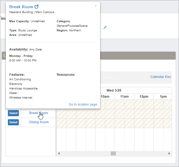 When using the location scheduler, you can now click the location's name on the calendar to display a pop-up of the location's details. Details such as the scheduling availability, maximum capacity, and features are displayed. You can click the location name at the top of the pop-up or the Go to location page link to open the location's page in a new window.